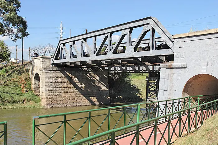 Logo, logo, chegamos à beira do rio Sorocaba. Caminhamos mais um pouco, às margens do rio, até chegarmos bem embaixo da ponte da linha férrea da Fepasa, que ainda hoje corta a marginal. Dava um baita medo, quando passava o trem, lá em cima. A impressão que tínhamos era que o trem poderia cair.